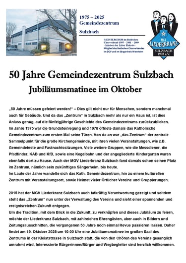 Der MGV Liederkranz Sulzbach lädt herzlich zur Jubiläumsmatinee anlässlich